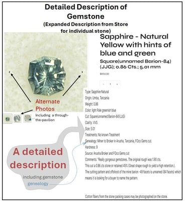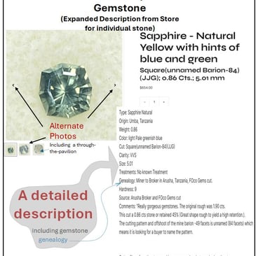 FOco Gems LLC can offer these incredibly low prices for top-quality gems because we purchased parcels in the countries where the stones are mined. We lived and/or worked in most of these places and could milk the best from the markets. That means our cost basis (not shown) is very different. The other surprise is the majority of gemstones are natural (not treated/ heated/ or altered). I am confident in the gems supplied to this website. Anyone is free to request a stone be GIA certified at the buyer's cost - If the gem is not as advertised I will pay for the appraisal.